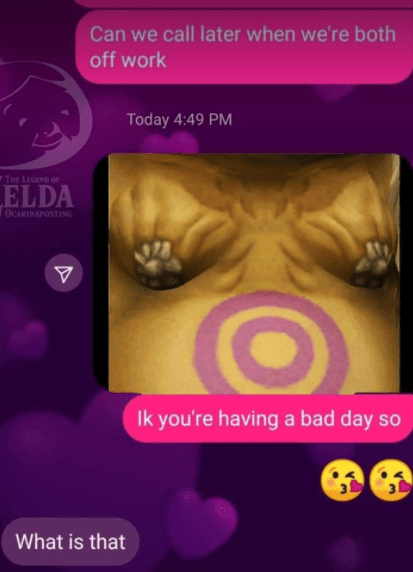Like many horrible things on the internet, it started with a shitpost. I hastily copied this picture to a facebook messenger group of my closest friends, fully realizing I would probably need to explain myself. And then I admitted that I recognized on sight that the nipples depicted were, in fact, those of the Goron Patriarch, Darbus, from the game The Legend of Zelda: Twilight Princess.